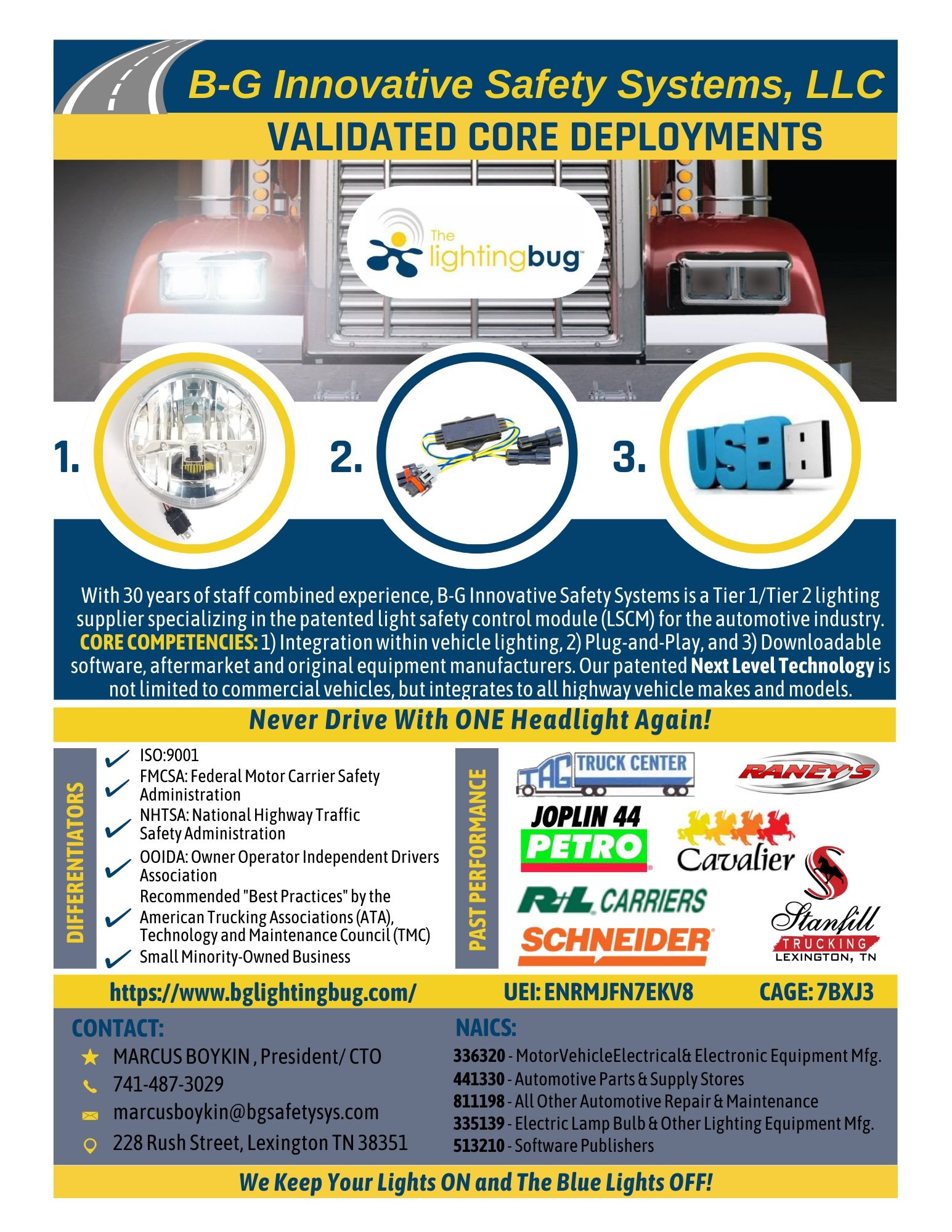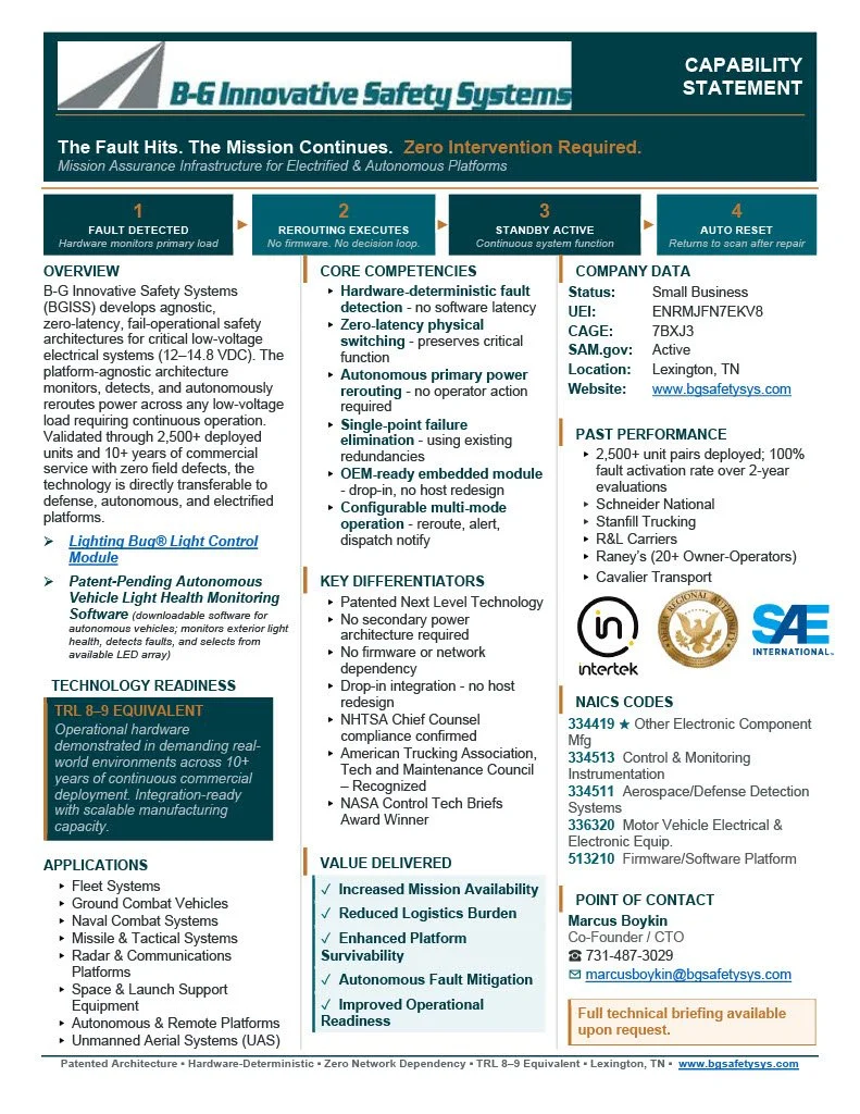 B-G Innovative Safety Systems (BGISS) develops agnostic, zero‑latency, fail‑operational safety architectures for critical low‑voltage electrical systems (12–14.8 VDC). The architecture was originally deployed and fully validated through safety‑critical lighting applications and is now transferable to a broad range of low‑voltage loads requiring continuous operation, fault detection, and operator alerting.